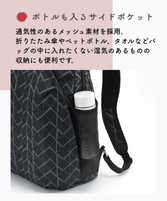 サイドポケットには通気性のあるメッシュ素材を採用し、濡れた傘やタオルの収納にも使えます。