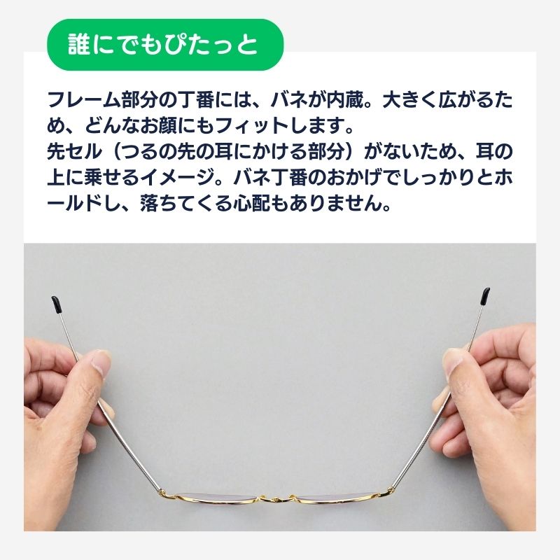 越前漆器漆塗りのケースが付属し、高級感溢れる厚メッキフレームが特徴。バネが入った丁番は、壊れにくくて快適な装着感で、どんな顔型にもフィットします。約8gの軽量設計で、旅行などでも大活躍!
