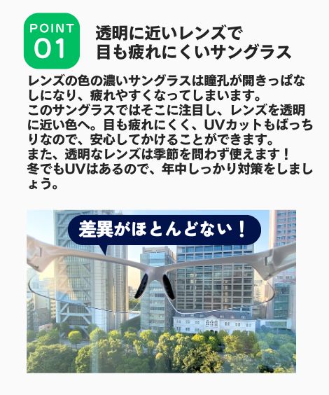 目の疲れを軽減する透明に近いレンズの「ウォーキングサングラス」が登場。
