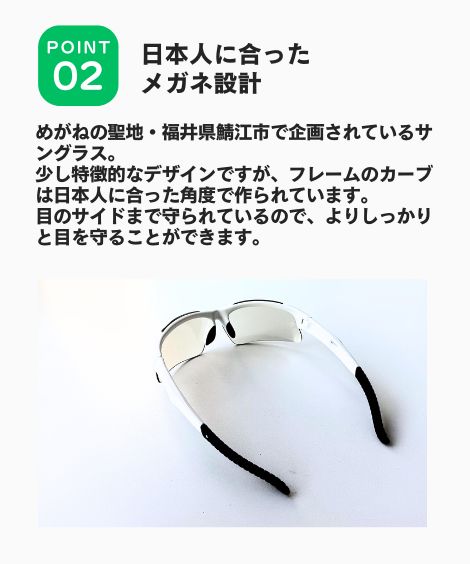 さらに、福井県鯖江市で企画されているこのサングラスは、日本人に合ったフレームカーブで、快適なフィット感を実現。目のサイドまで守られるデザインで、花粉症対策にも。